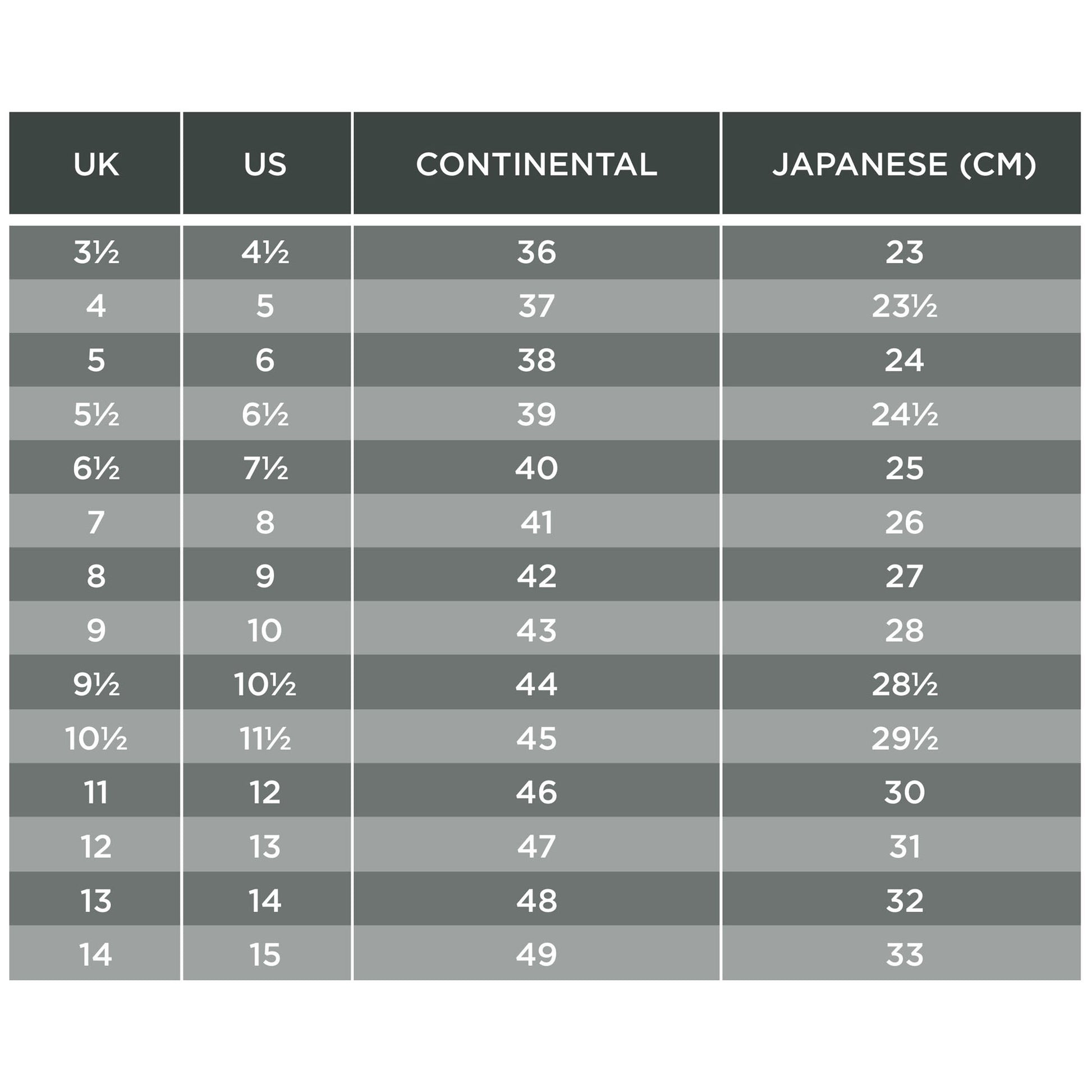 • EU 36 – 48 (UK 3½ – 13)